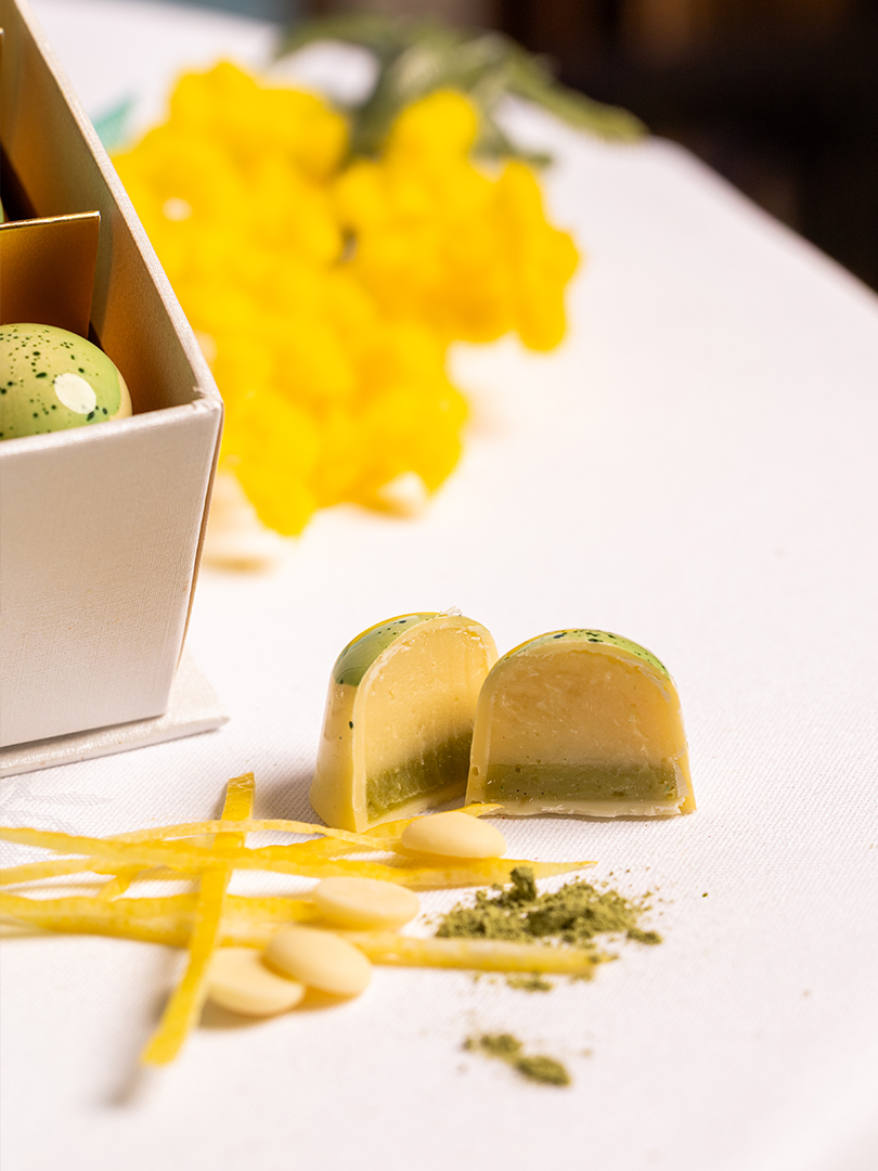 Yuzu meyvesi, matcha, krema, tereyağı, beyaz çikolata, şeker.