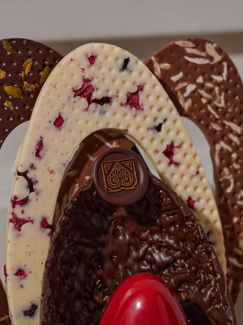 Bitter çikolata, sütlü çikolata, beyaz çikolata, fındık, fıstık, badem, krep kırığı, şeker, krema, limon püresi, tereyağı, kurutulmuş kırmızı orman meyveleri.
