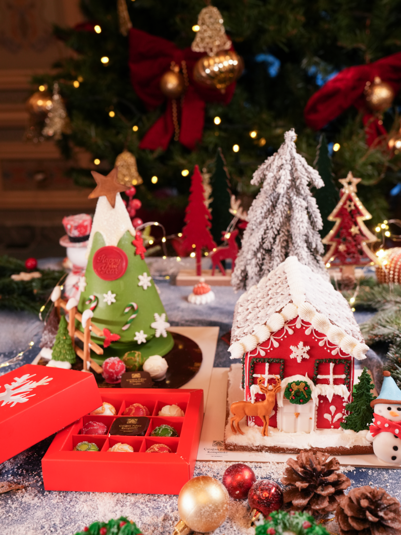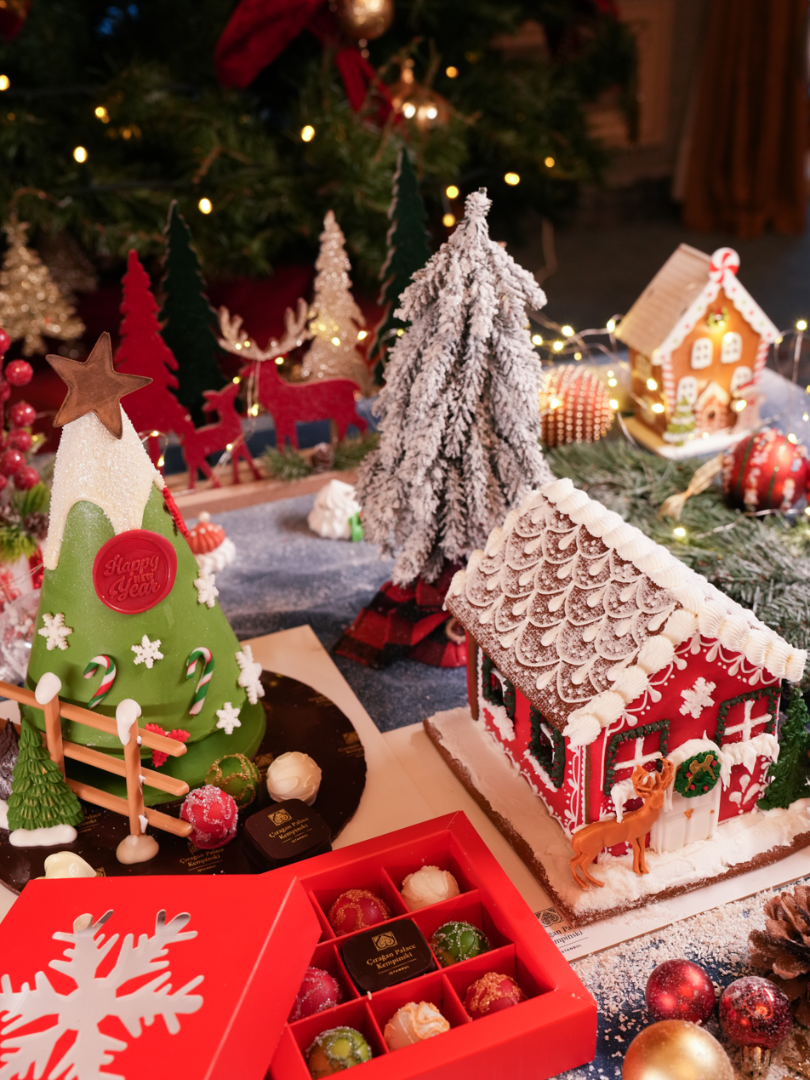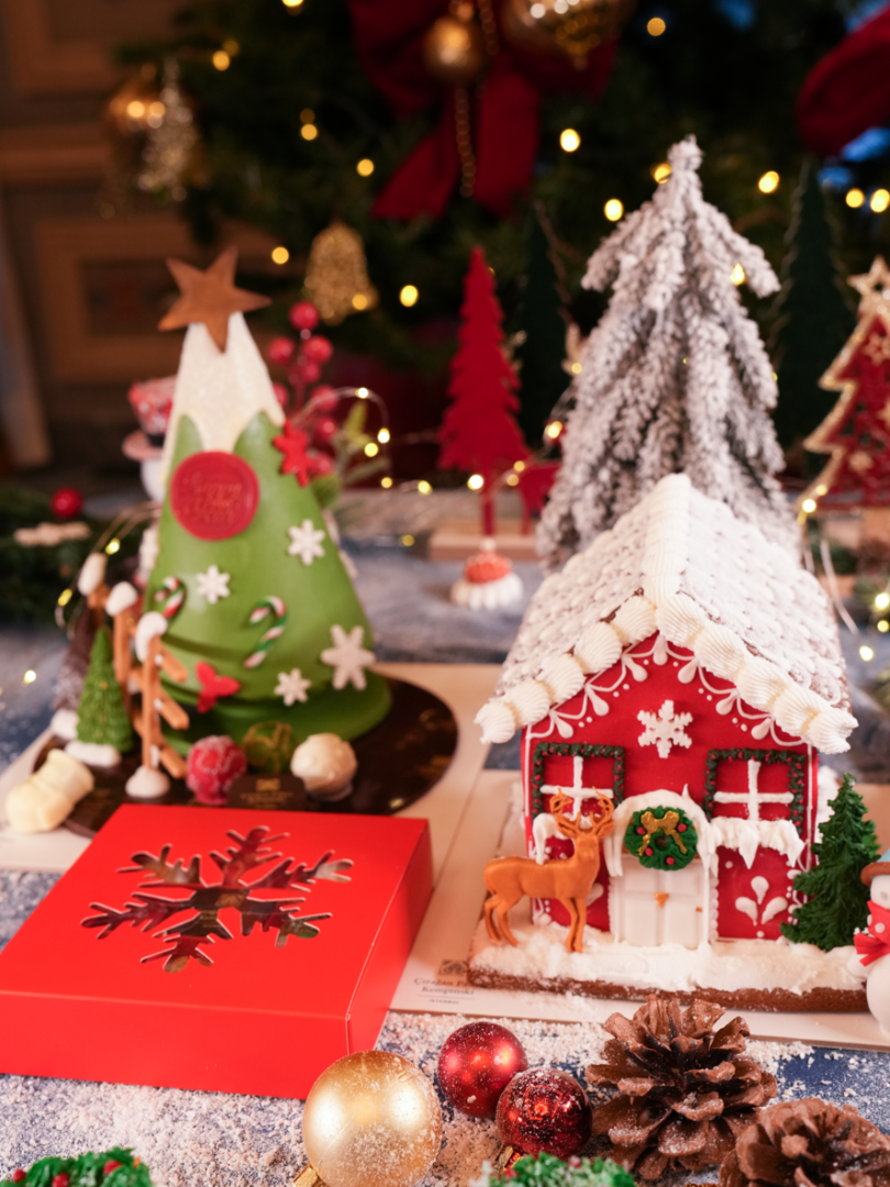 Yılbaşı Temalı Zencefilli Kurabiye Evi - Küçük: Bal, un, tereyağı, yumurta beyazı, esmer şeker, zencefil, şeker hamuru Yılbaşı Temalı Çikolatalar: Bitter çikolata, fındık, fıstık, sütlü çikolata, beyaz çikolata, badem, şeker, krep kırığı Yılbaşı Ağacı Figürlü Çikolata: Bitter çikolata, sütlü çikolata, beyaz çikolata, yumurta, şeker, tereyağı, fındık, fıstık, badem, krep kırığı, şeker hamuru